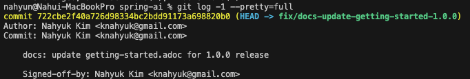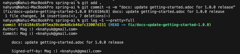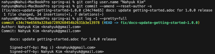- 주의 할 점은 이름 덮어쓰기를 하게 되면 Signed-off-by 는 하나 더 생기게 된다. 이 부분은 직접 에디터로 들어가서 지워줘야 함.