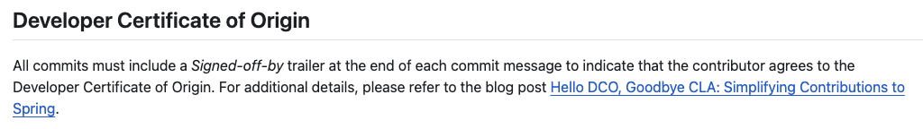 참고: Hello DCO, Goodbye CLA: Simplifying Contributions to Spring